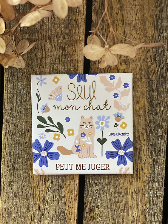 - Design : Chat beige au milieu de fleurs, message « Seul mon chat peut me juger »